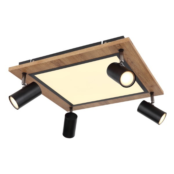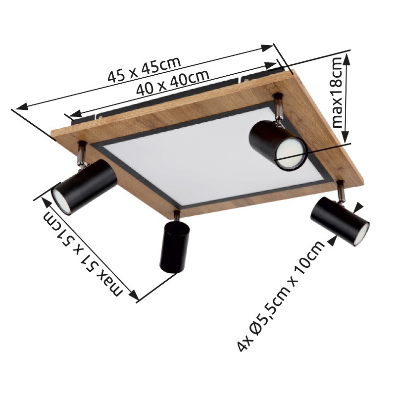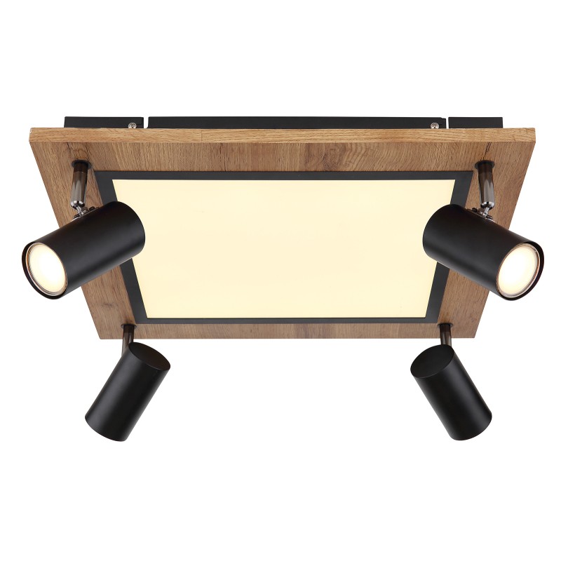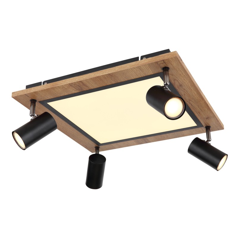 Die Leuchte besteht aus schwarzem Metall, MDF mit Holzdekor und weißem Kunststoff. Diese quadratische Variante der Deckenleuchte mit Abmessungen 45x45 cm ist mit einem zentralen LED-Panel und vier Strahlern ausgestattet mit GU10-Fassung.