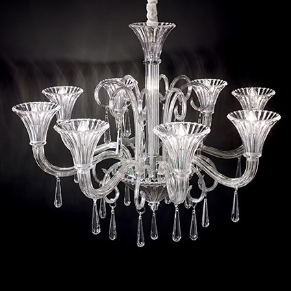 Eine Serie mundgeblasener Luxus-Wandleuchten und Kronleuchter für repräsentative oder größere Räume. Die gesamte Leuchte besteht aus mundgeblasenem transparentem Glas, präzise geformte Arme in klaren…