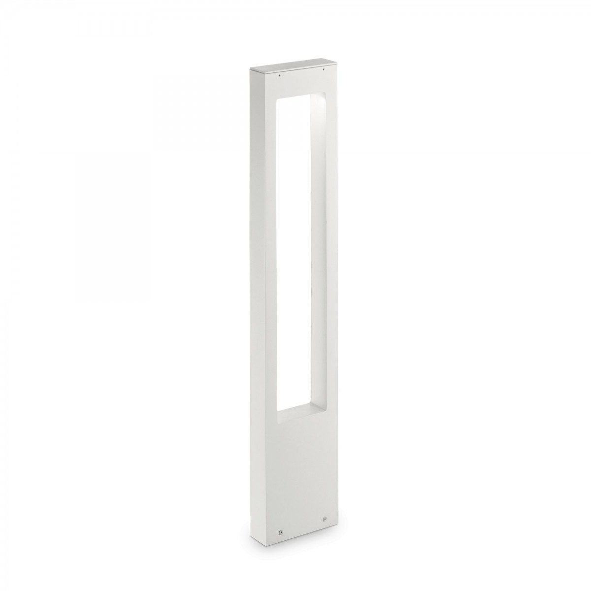 Aluminiumsäule mit matter Oberfläche, mit einem quadratischen Ausschnitt, in dessen oberem Teil sich ein Diffusor aus transparentem gehärtetem Glas befindet. Eine moderne Ergänzung für den Garten.