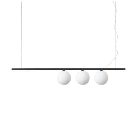 Das dünne Rohrgestell der Lampe besteht aus hochwertigem Metall mit mattschwarzer Oberfläche, was der Lampe ein modernes und elegantes Aussehen verleiht. Drei Diffusoren aus weißem mundgeblasenem Glas sorgen für eine weiche und angenehme Lichtverteilung. Zwei durchsichtige Teflon-Stromkabel werden direkt an der Decke befestigt und sind von 42 cm bis 220 cm höhenverstellbar, was eine flexible Installation ermöglicht.