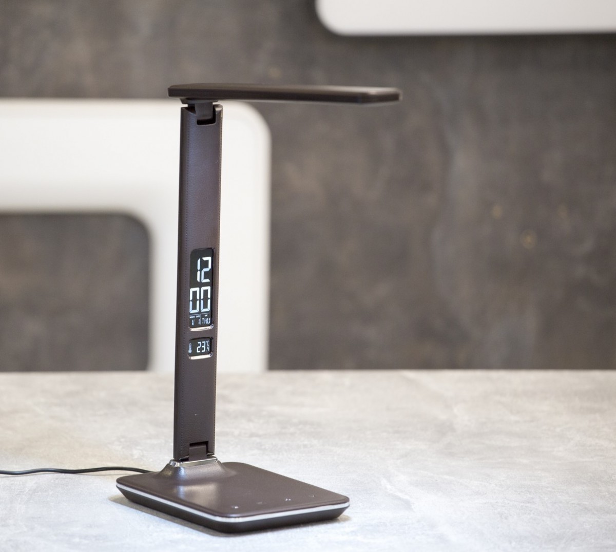 LED-Tischleuchte KINGFISHER BLACK in schwarzem Lederimitat „mit Nähten“ sorgt nicht nur im Büro für einen stilvollen Eindruck. Das Informationsfeld der Lampe verfügt über ein LED-Display , das die…