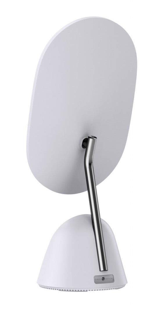 Kosmetikspiegel FACE auf hohem Sockel mit ovaler Spiegelform, LED-Beleuchtung und kabellosem Qi-Laden.