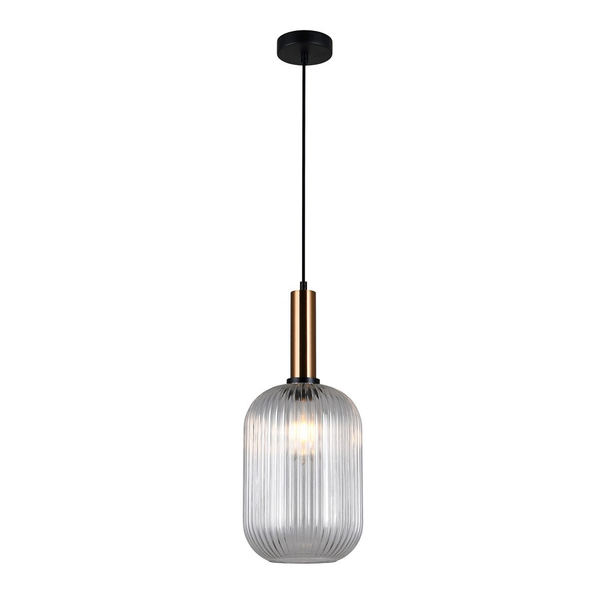 Durch die Rippen um den Umfang der massiven Lampe verleiht sie dem beleuchteten Licht Dynamik, behält aber auch im ausgeschalteten Zustand ihren Charme. Das Glas dieses Kronleuchters ist transparent, was die Aufmerksamkeit etwas auf die Glühbirne selbst lenkt.