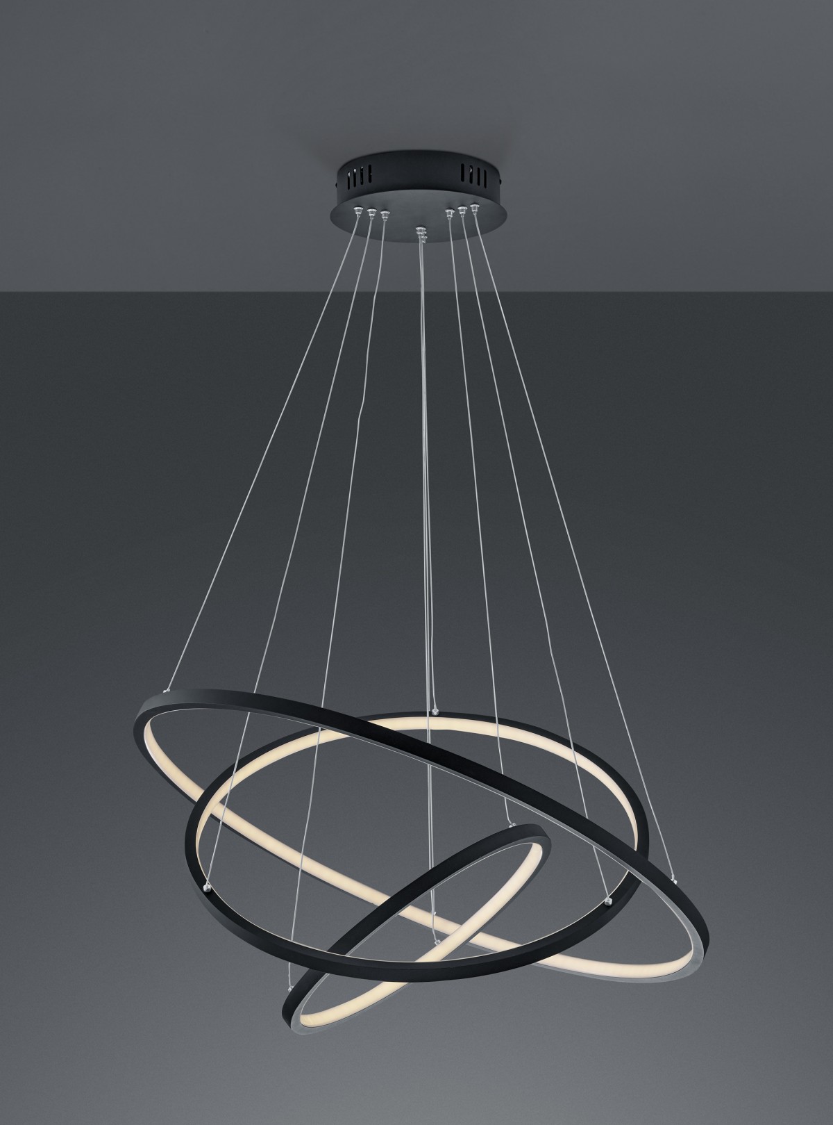 Die Konstruktion besteht aus 3 unterschiedlich großen Kreisen mit integrierten LED-Quellen mit schwarzem Finish. Die Kreise sind vom Größten zum Kleinsten angeordnet und werden an dünnen Stahlseilen aufgehängt. Die Seile kommen von der Deckenrosette in einem eleganten Schwarz.