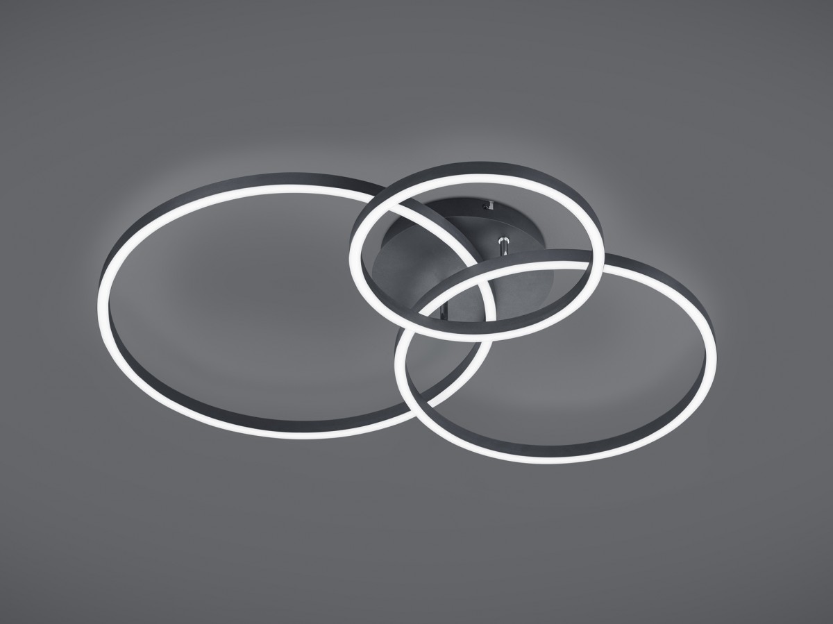 Diese moderne Deckenleuchte aus der WINONA wird definitiv eine Dekoration für jeden Raum in Ihrem Interieur sein. Es hat die Form von drei überlappenden Kreisen aus metallischem Material in mattschwarzer Farbe. Seine Breite erreicht 780 mm und seine Höhe 115 mm, sodass er auch für weniger geräumige Räume mit niedrigeren Decken geeignet ist, egal ob es sich um ein Arbeits- oder Wohnzimmer handelt.< br / >