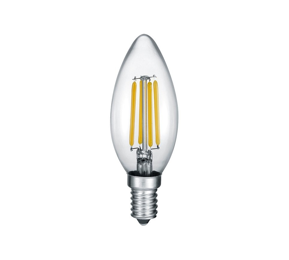 Kerze LED Birne 989-4470 aus der Werkstatt des deutschen Herstellers Trio wird Sie definitiv nicht enttäuschen, wie es oft so ist Bei diesem Hersteller ist das der Fall. Das Leuchtmittel ist mit einer E14-Fassung ausgestattet. Es ist 99 mm hoch und hat einen Durchmesser von 35 mm. Als Material wird transparentes Glas verwendet. Die Leistungsaufnahme beträgt 4 Watt, emittiert also 470 lm bei einer Farbtemperatur von 2700 K (warmes gelbes Licht). Ein zusätzliches Merkmal der LED-Lampe Kerze ist die Option Stufendimmung, immer in Intervallen von 100 %, 50 %, 25 % und 0 %.